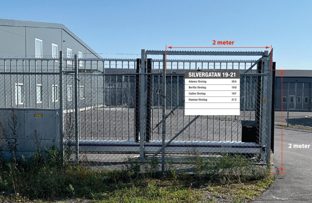 Skylten är tänkt att sitta direkt till vänster om grinden vid infarten till området och det ska då tydligt framgå vilka företag som huserar på området. Se fotot med förslag på utformning.